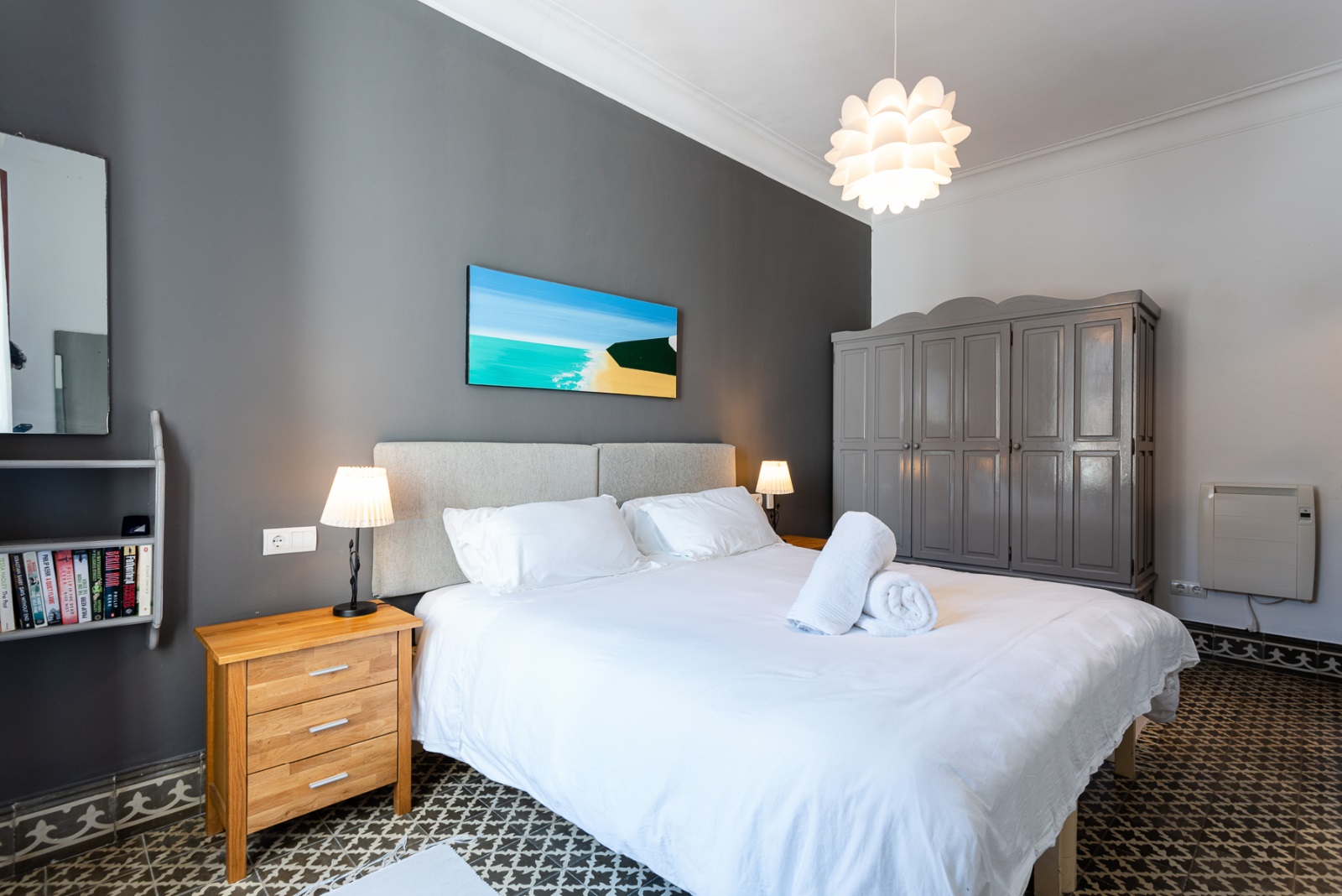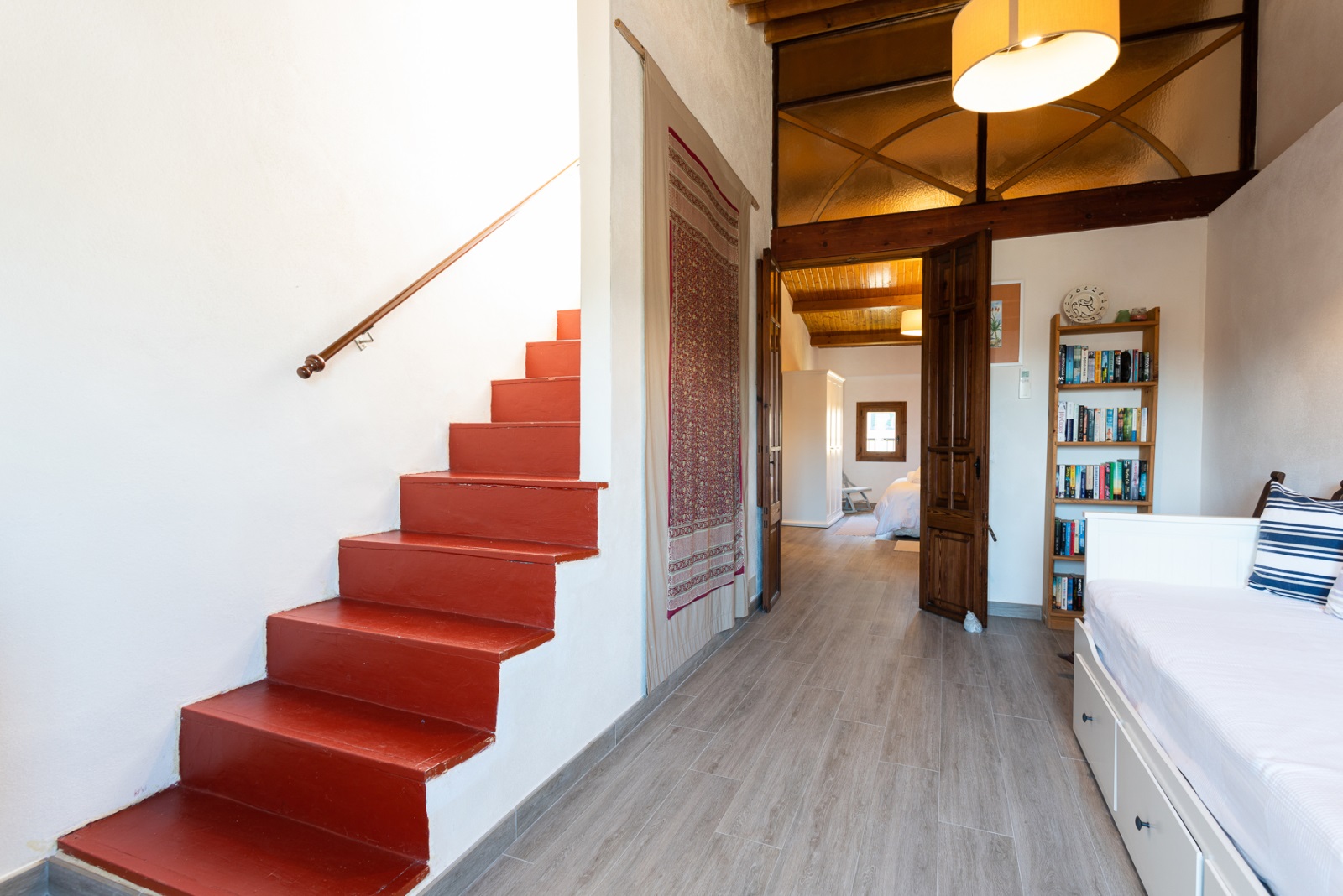 Das Obergeschoss ist über das Esszimmer auf der Eingangsebene zugänglich und führt zu zwei Schlafzimmern. Beide Schlafzimmer haben schöne original mallorquinische Fußböden, weiß gestrichene Wände und sind mit Klimaanlage ausgestattet.