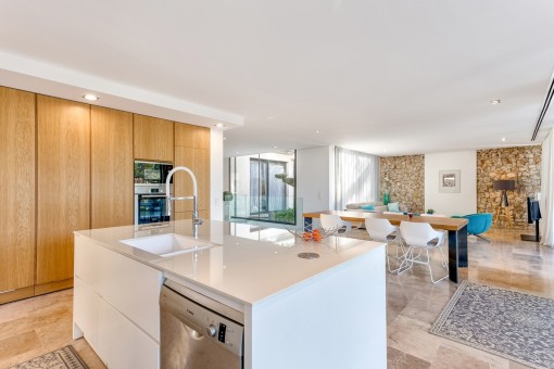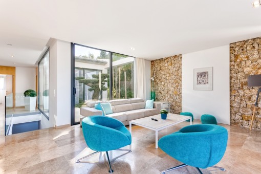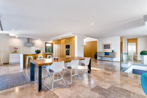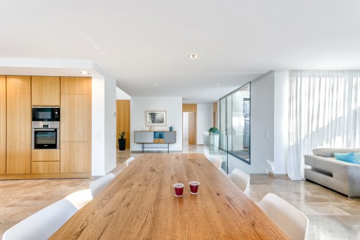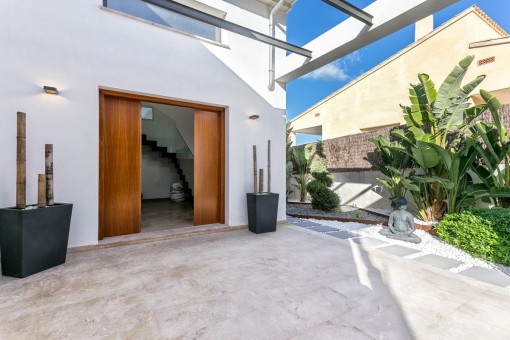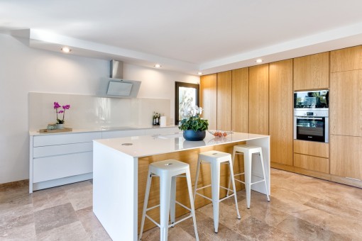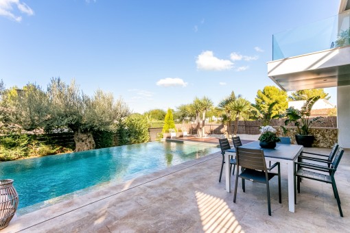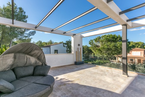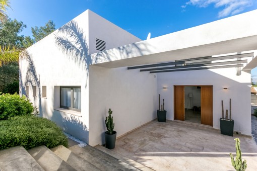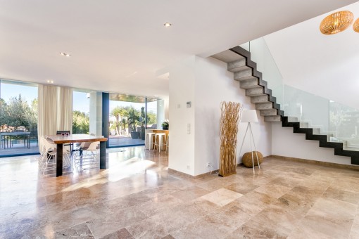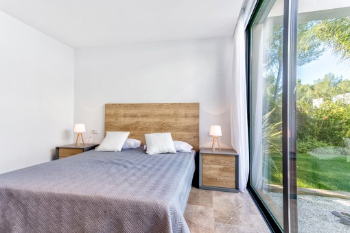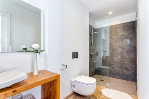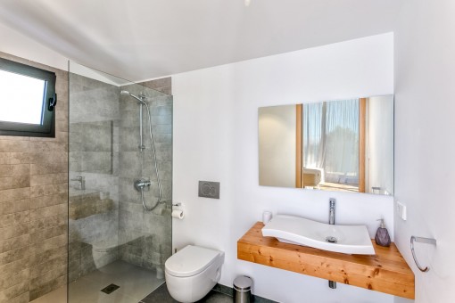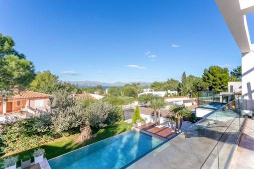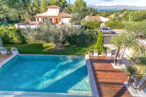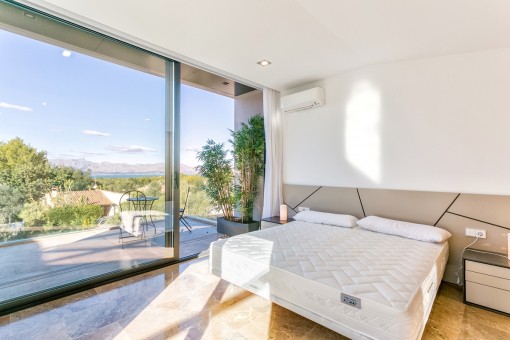 Im Obergeschoss befindet sich das Hauptschlafzimmer mit Bad on Suite und einer großen Terrasse von der aus man eine fantastische Aussicht auf den schön angelegten Garten und einen Fernblick auf die Bucht von Pollensa hat.