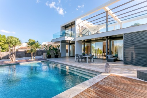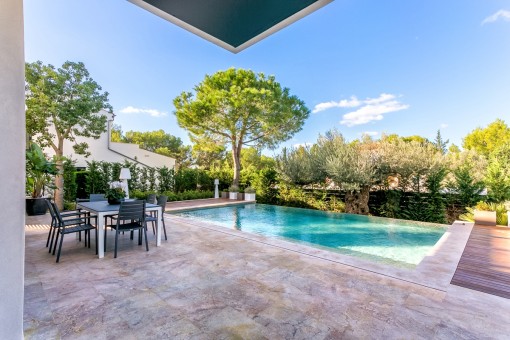 Der Aussenbereich bietet einen Garten und einen Pool zum baden und relaxen.
