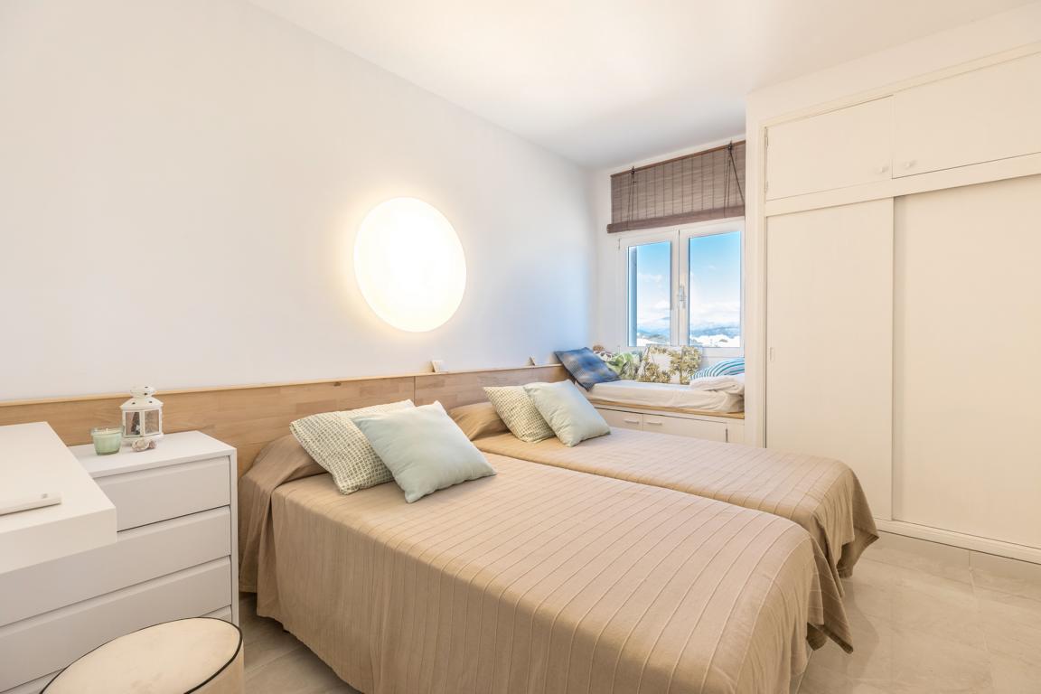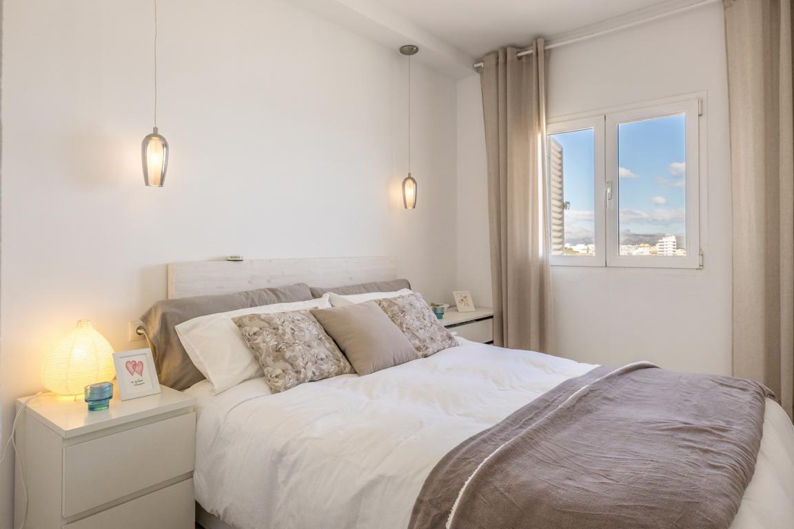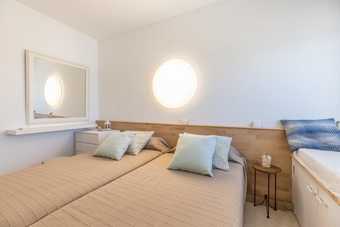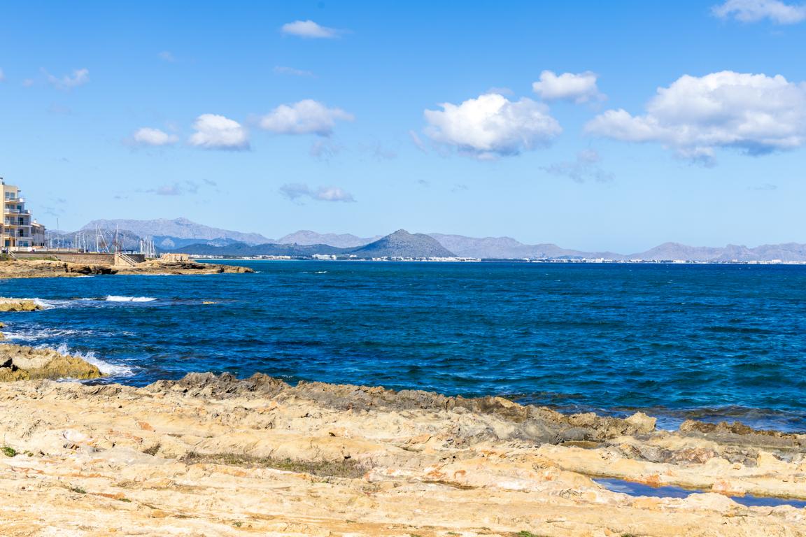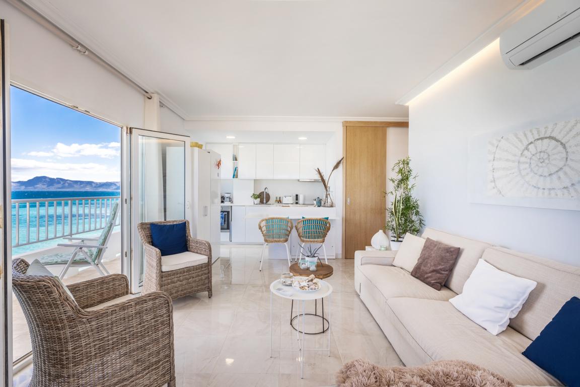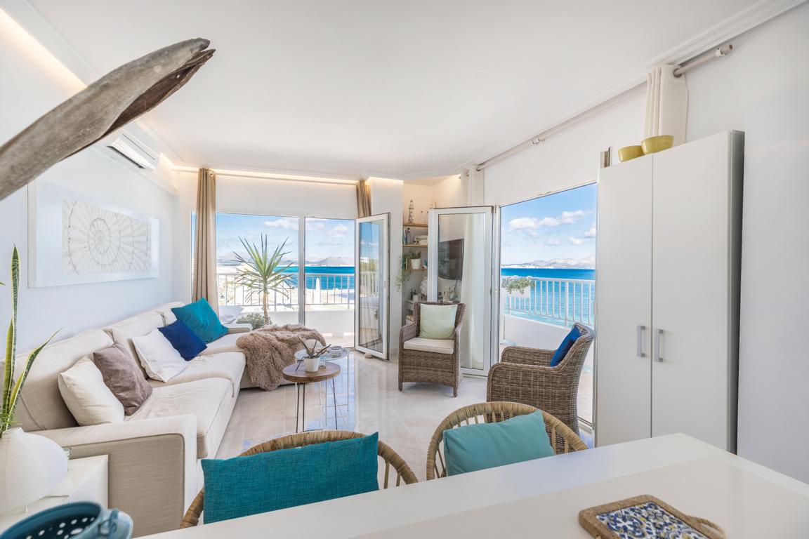 Die vor kurzem renovierte Wohnung hat eine Wohnfläche von etwa 65 m², hat 2 Schlafzimmer, 2 Bäder, ein Wohnzimmer mit offener Küche, die auf beiden Seiten nach aussen, in kleine Terrassenflächen sich öffnet und wo man jede Tagesstunde geniessen kann. Wenn man die Wohnung betritt, wird man von einem einmaligen wunderbaren weitreichenden Meerblick auf die Bucht von Alcudia empfangen.