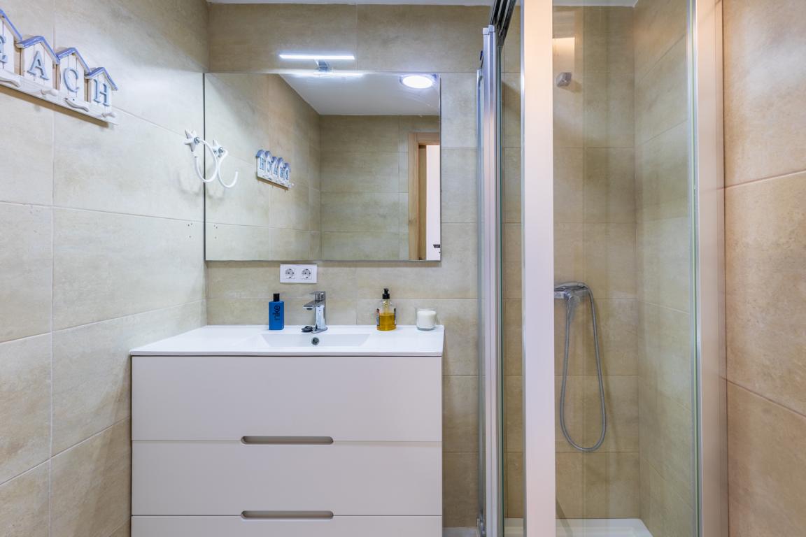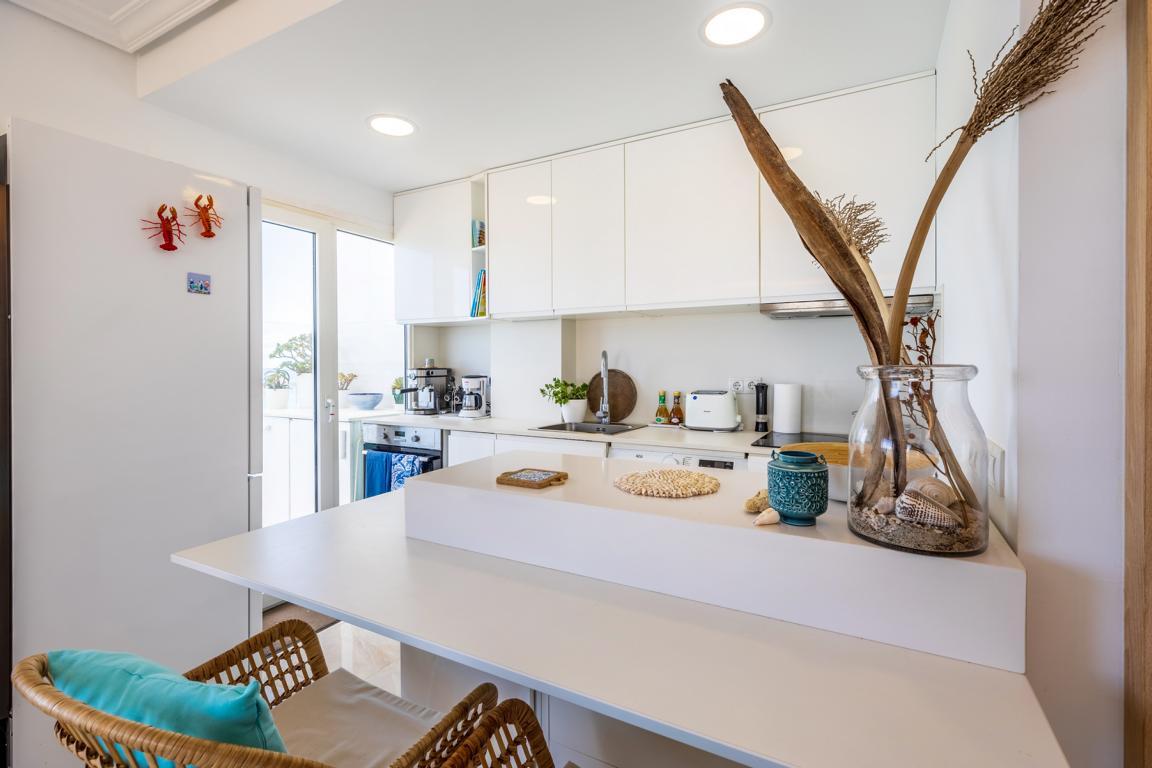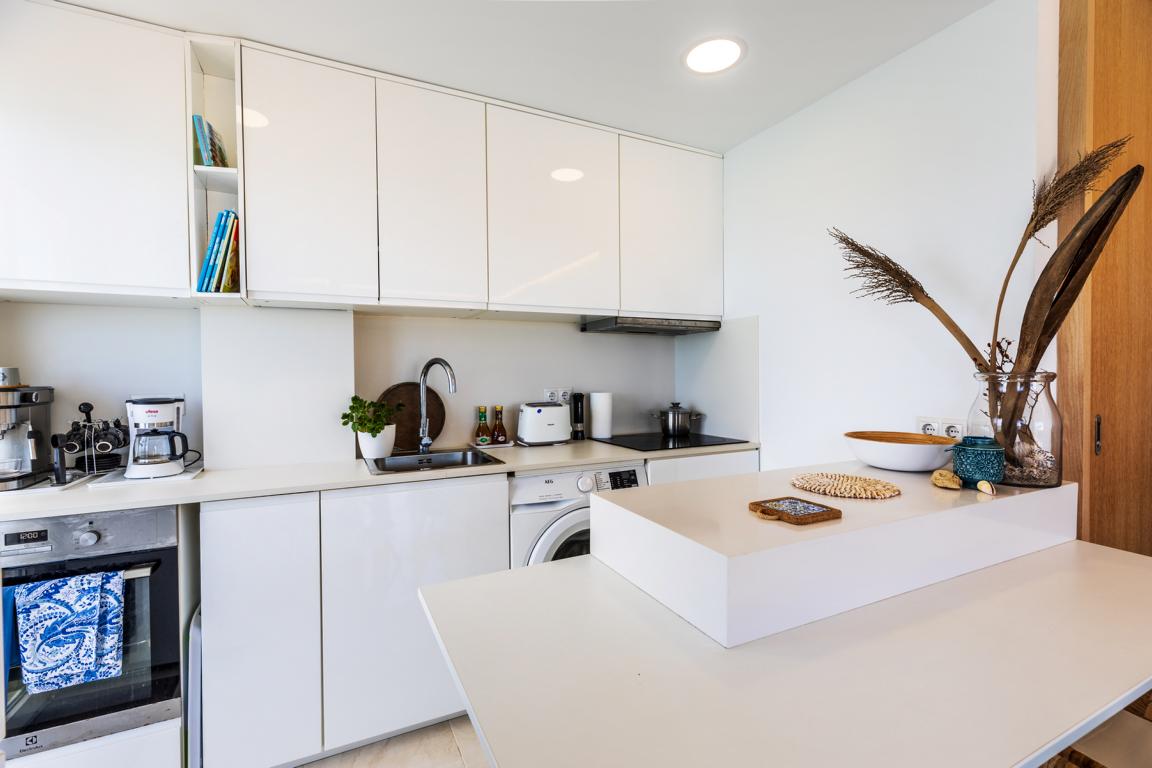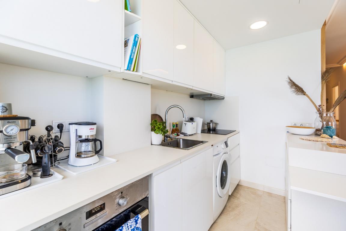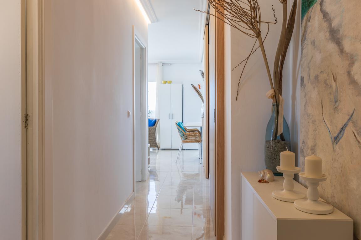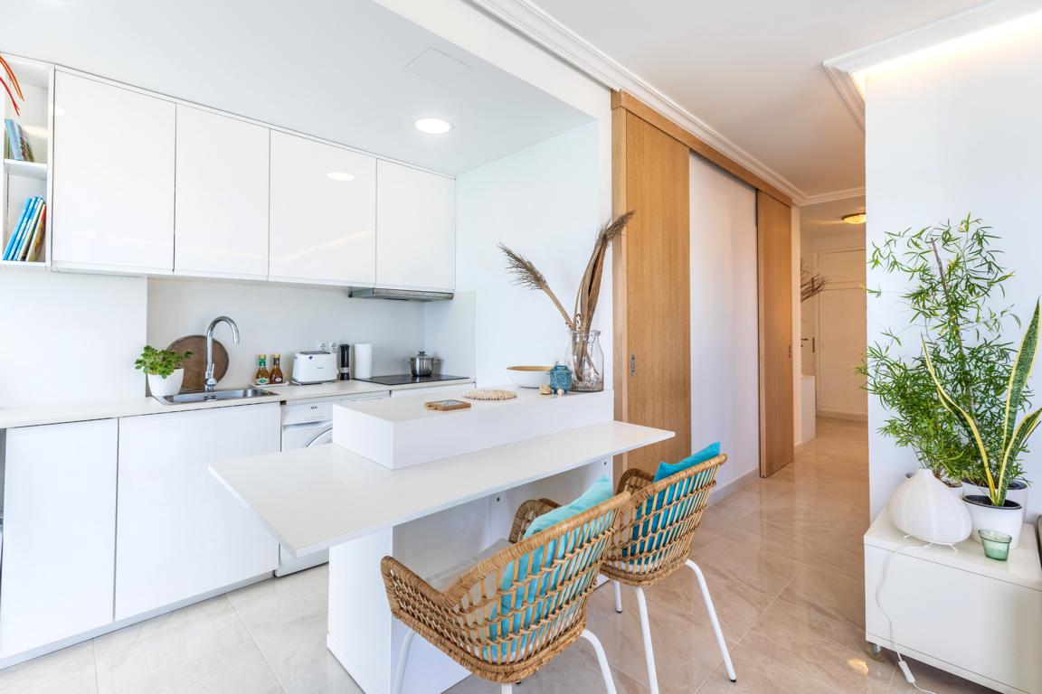 Die vor kurzem renovierte Wohnung hat eine Wohnfläche von etwa 65 m², hat 2 Schlafzimmer, 2 Bäder, ein Wohnzimmer mit offener Küche, die auf beiden Seiten nach aussen, in kleine Terrassenflächen sich öffnet und wo man jede Tagesstunde geniessen kann. Wenn man die Wohnung betritt, wird man von einem einmaligen wunderbaren weitreichenden Meerblick auf die Bucht von Alcudia empfangen.