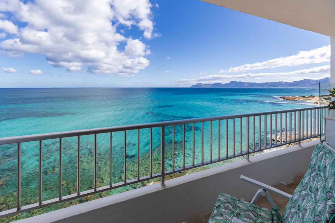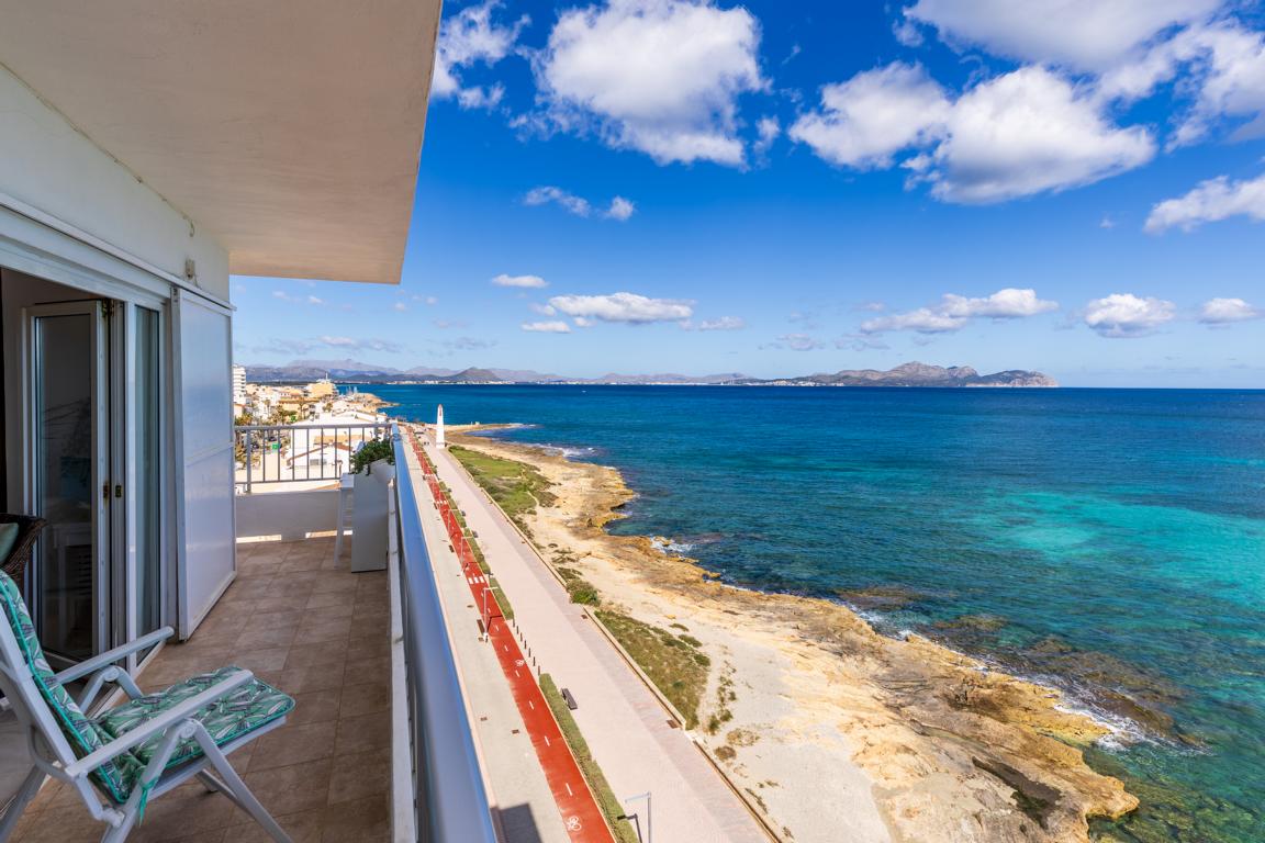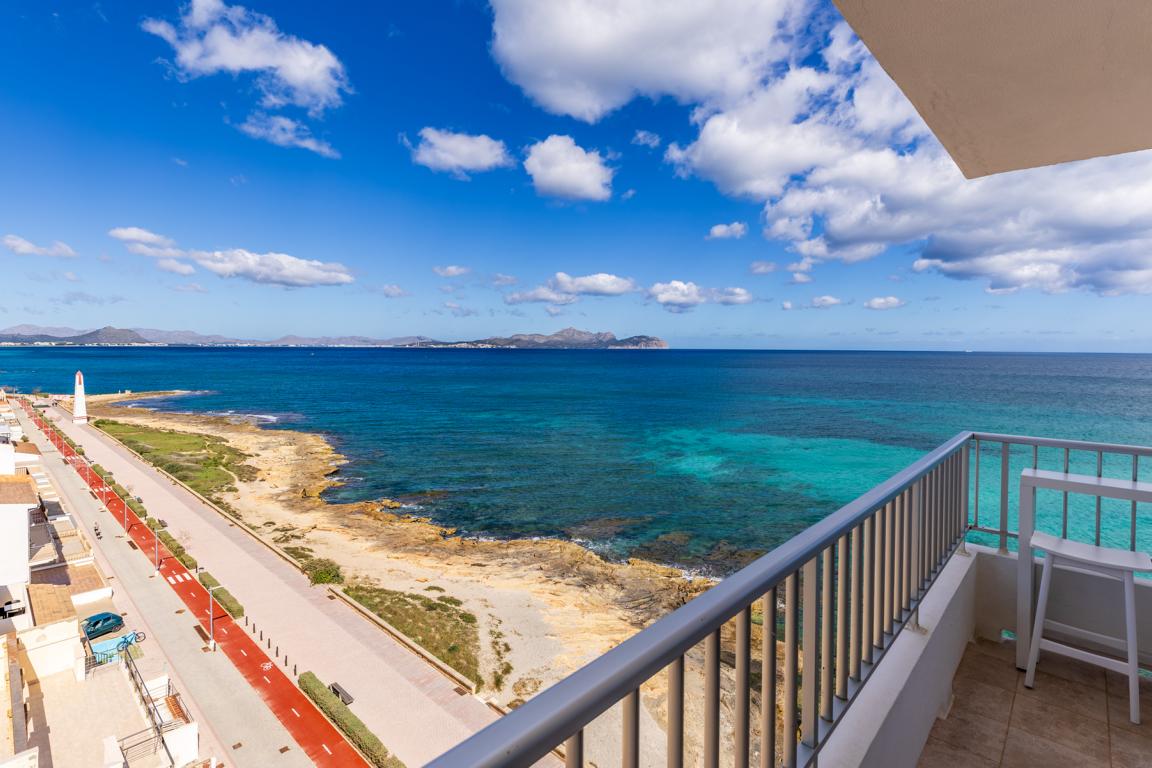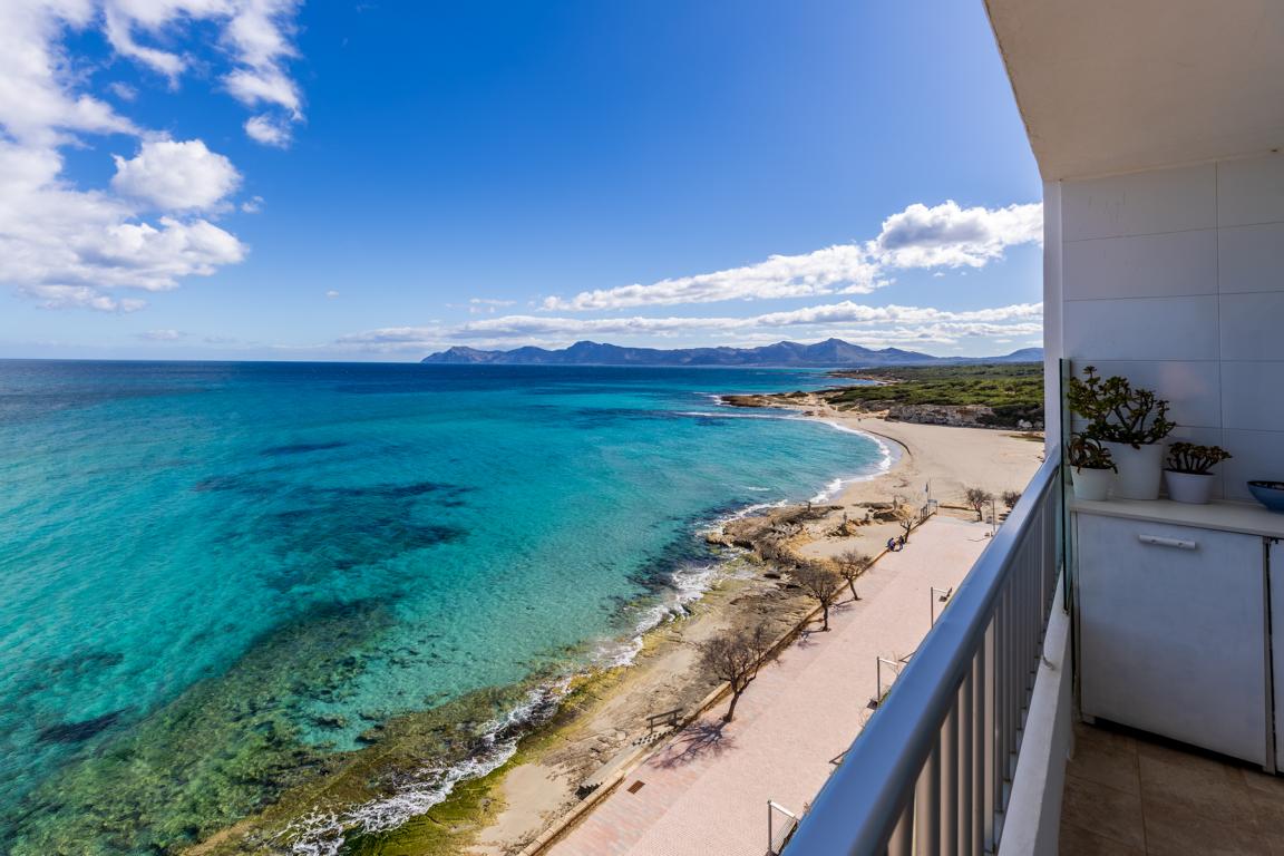 Die Wohnung hat eine Ecklage, sodass man seitlich von den Schlafräumen auf die Dächer und den Strand von Can Picafort blickt und nach vorne auf das Meer und auf der anderen Seite zum Strand von Son Baulo und bis nach Son Real und deren unverbaute Strände sieht. Die Wohnung hat eine gute Aufteilung. Sie liegt im 6. Stock. Nur die ruhige Fussgängerzone am Ende von Can Picafort trennt den Strand von der Immobilie. Eine einmalige Gelegenheit eine Immobilie in erster Linie in Bestlage zu finden.