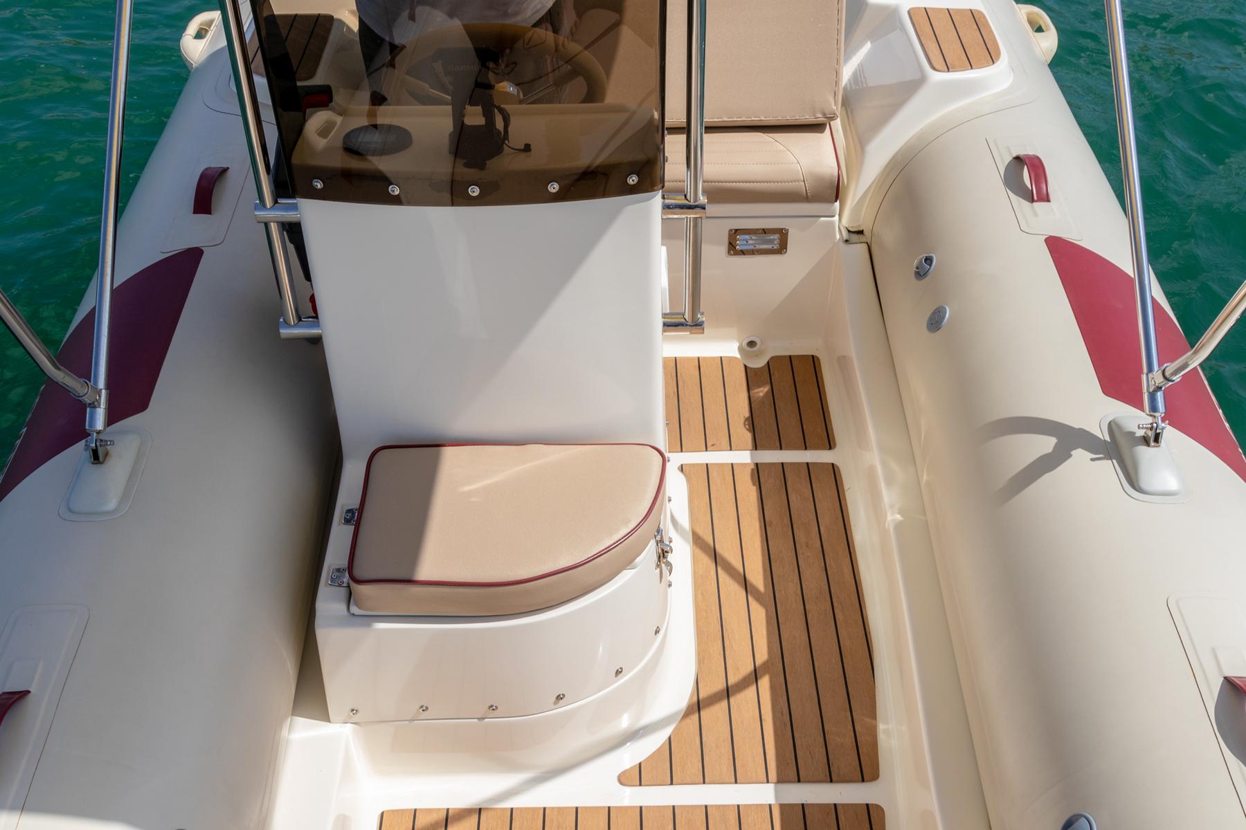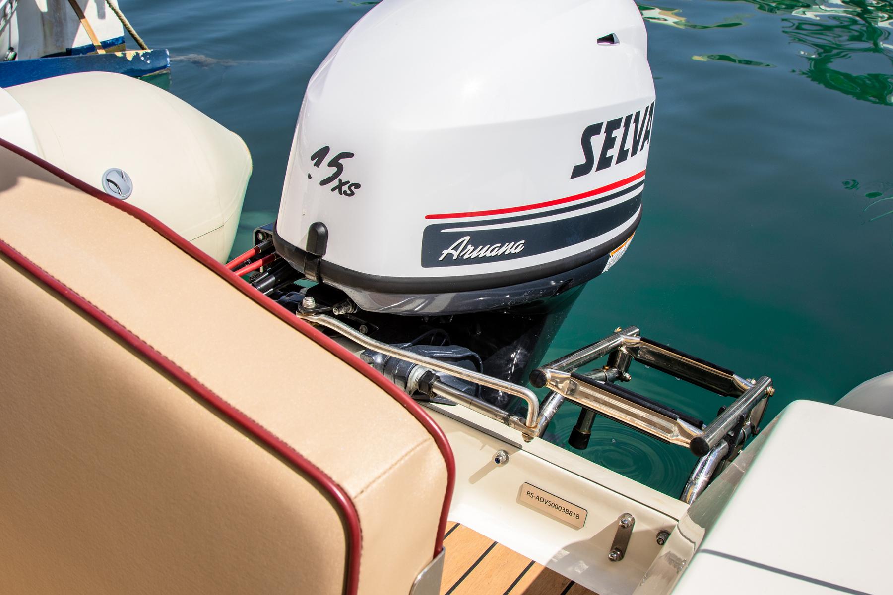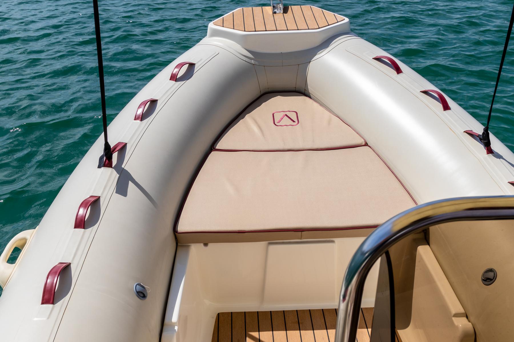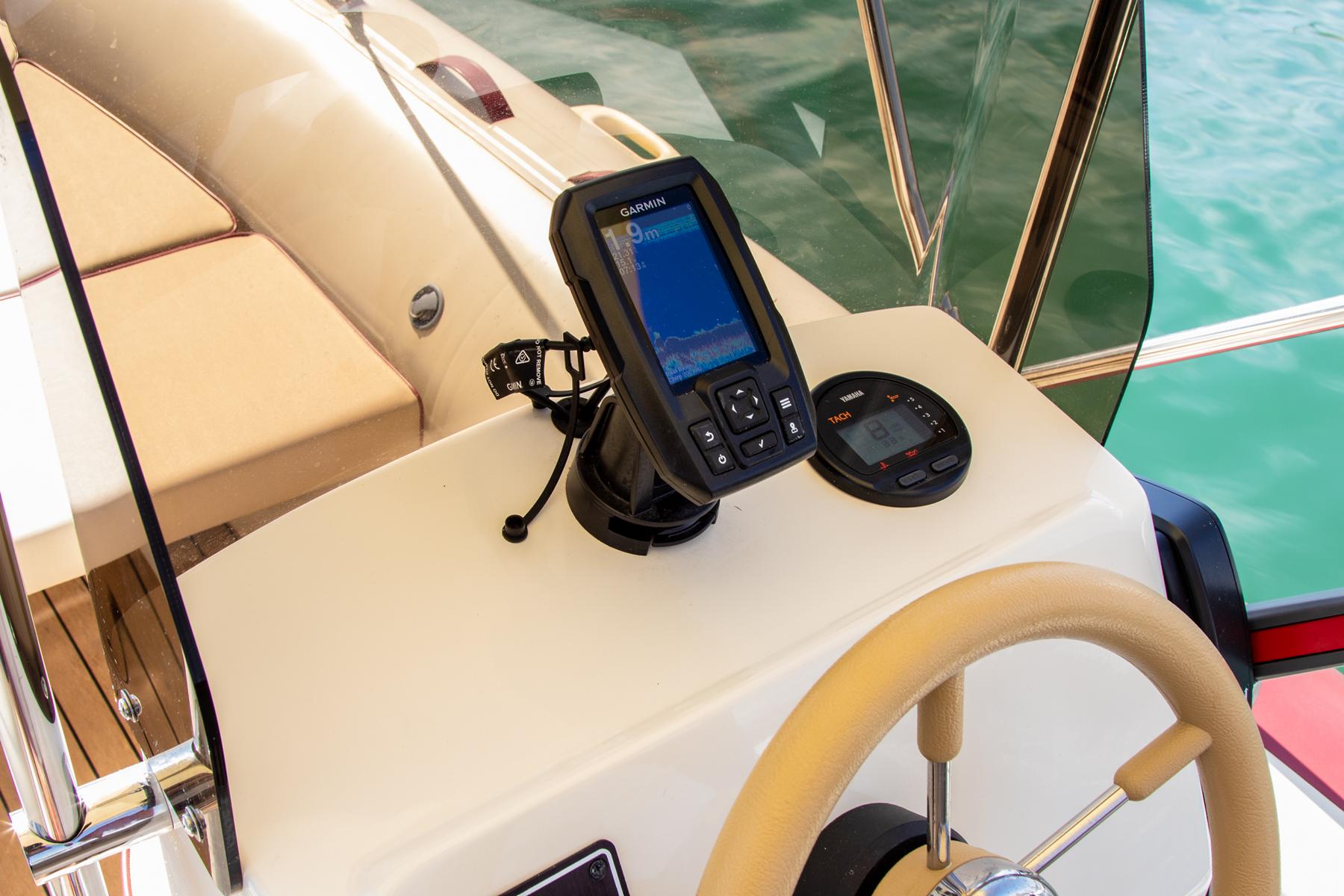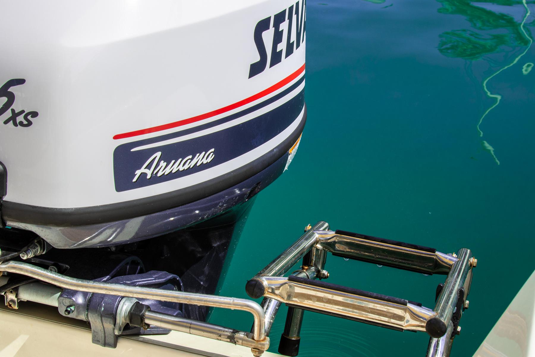 Ausgestattet mit: Tiefenmesser, Badeleiter, Sonnenverdeck, Schwimmwesten, Kühlbox