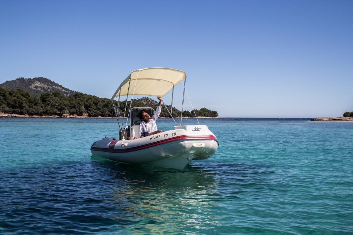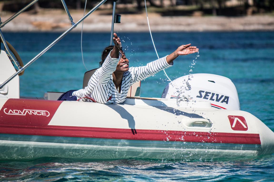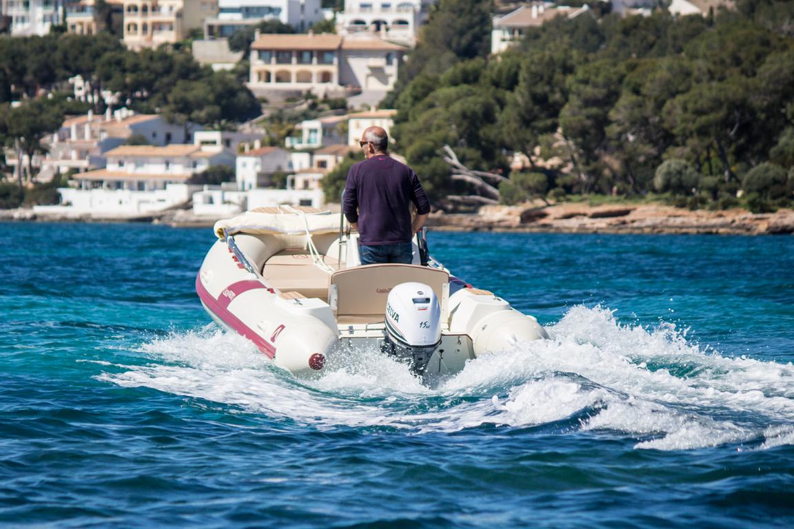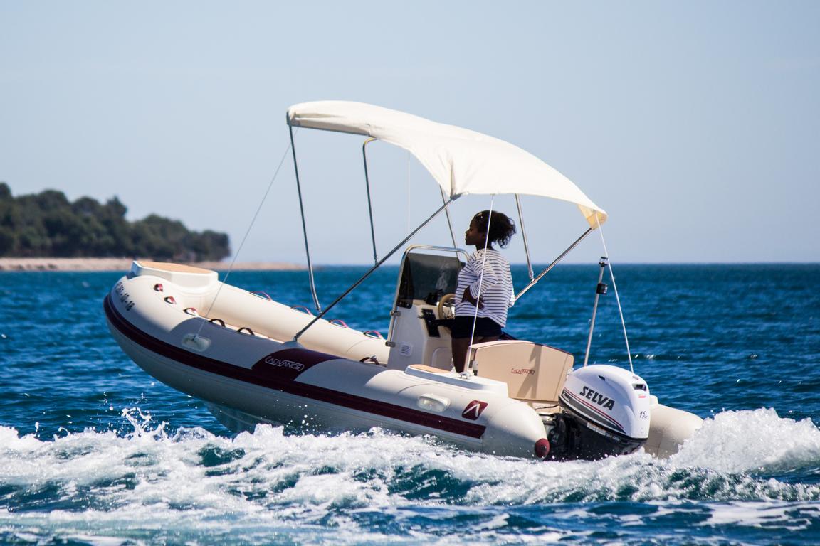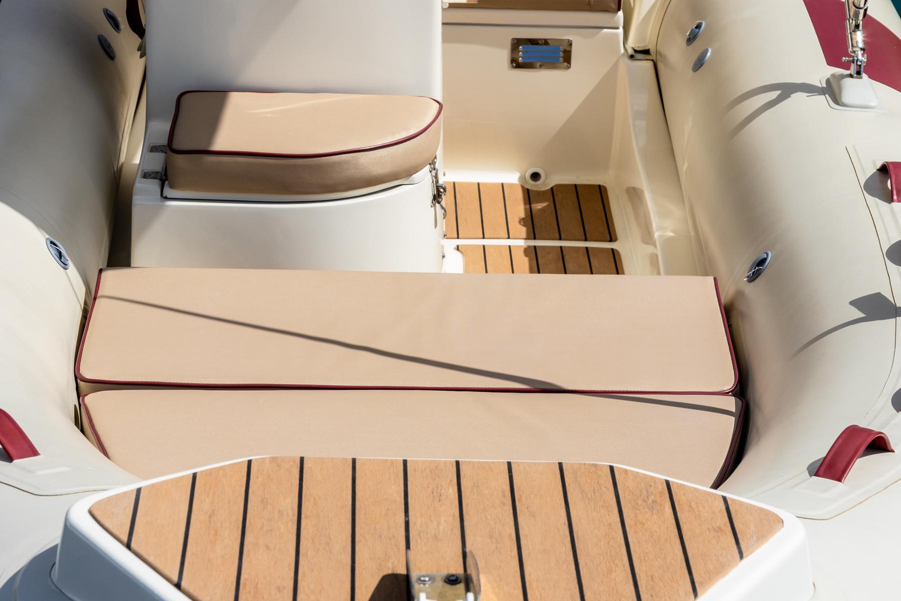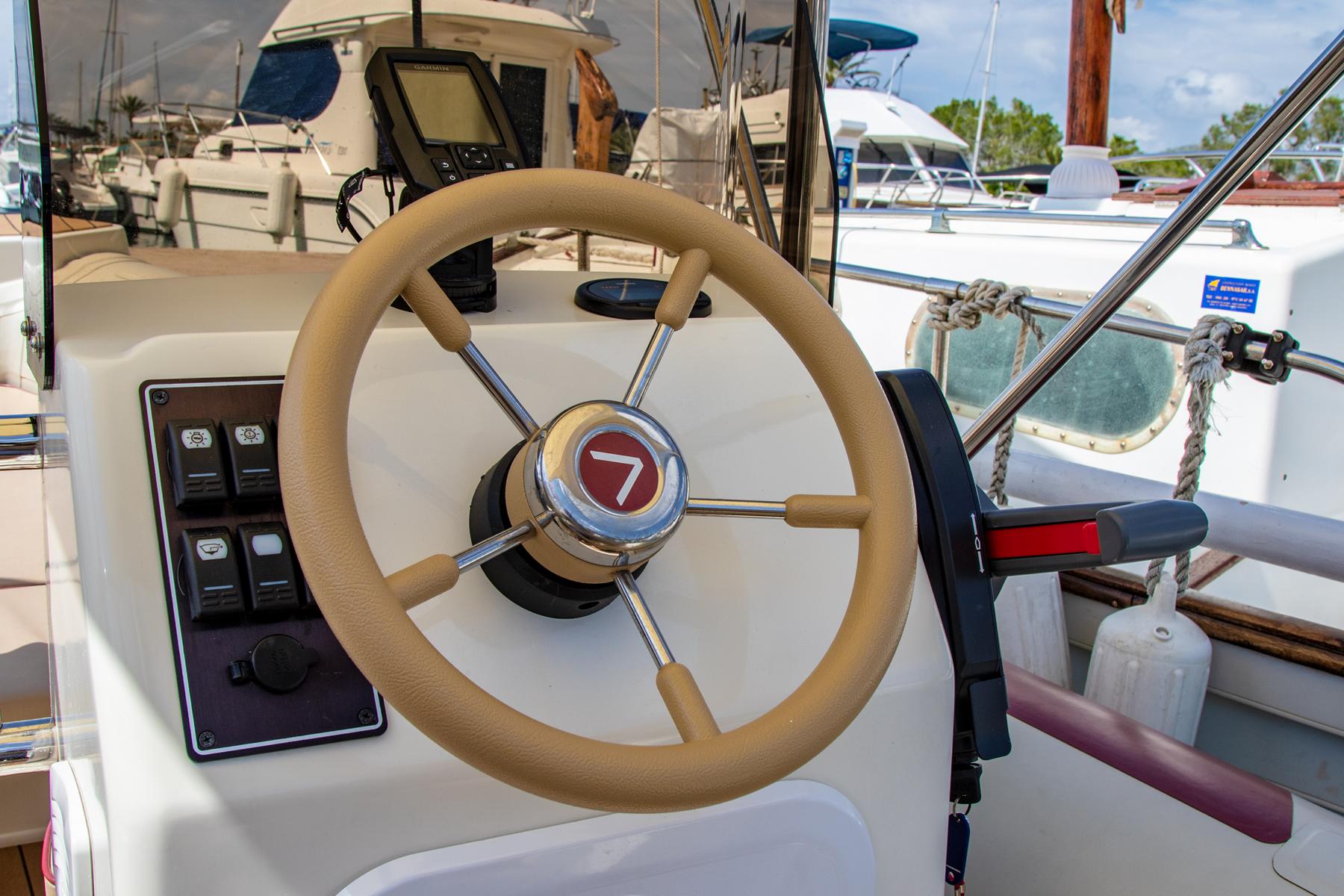 Ausgestattet mit: Tiefenmesser, Badeleiter, Sonnenverdeck, Schwimmwesten, Kühlbox