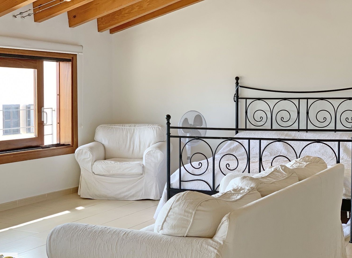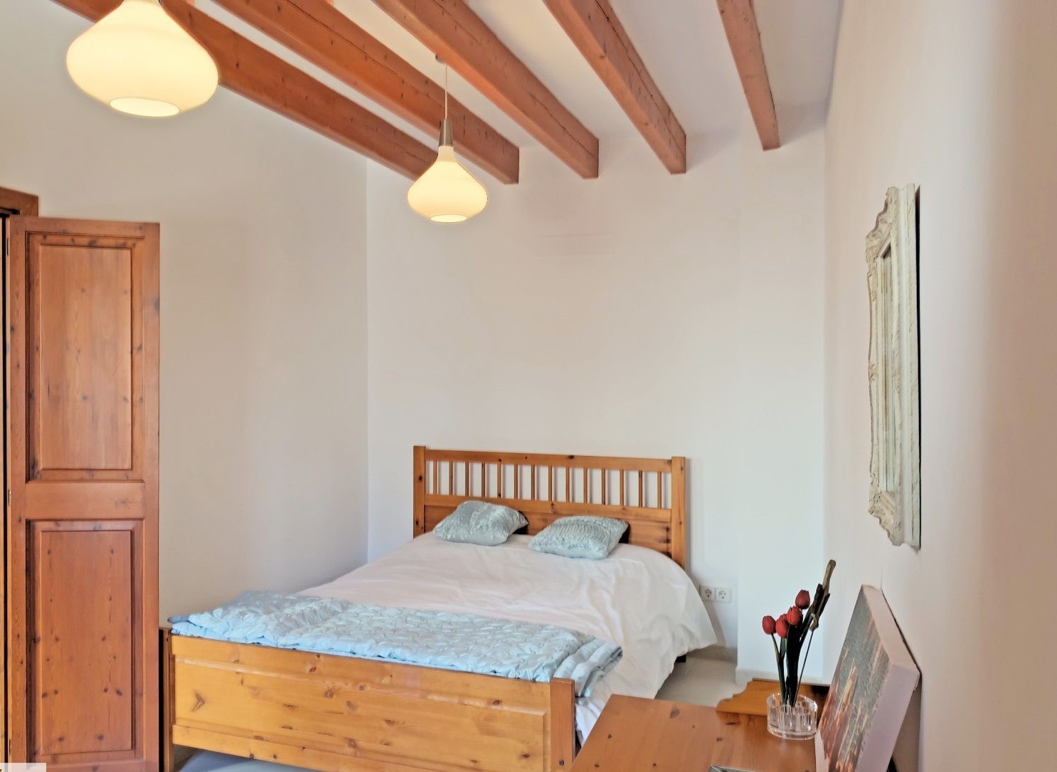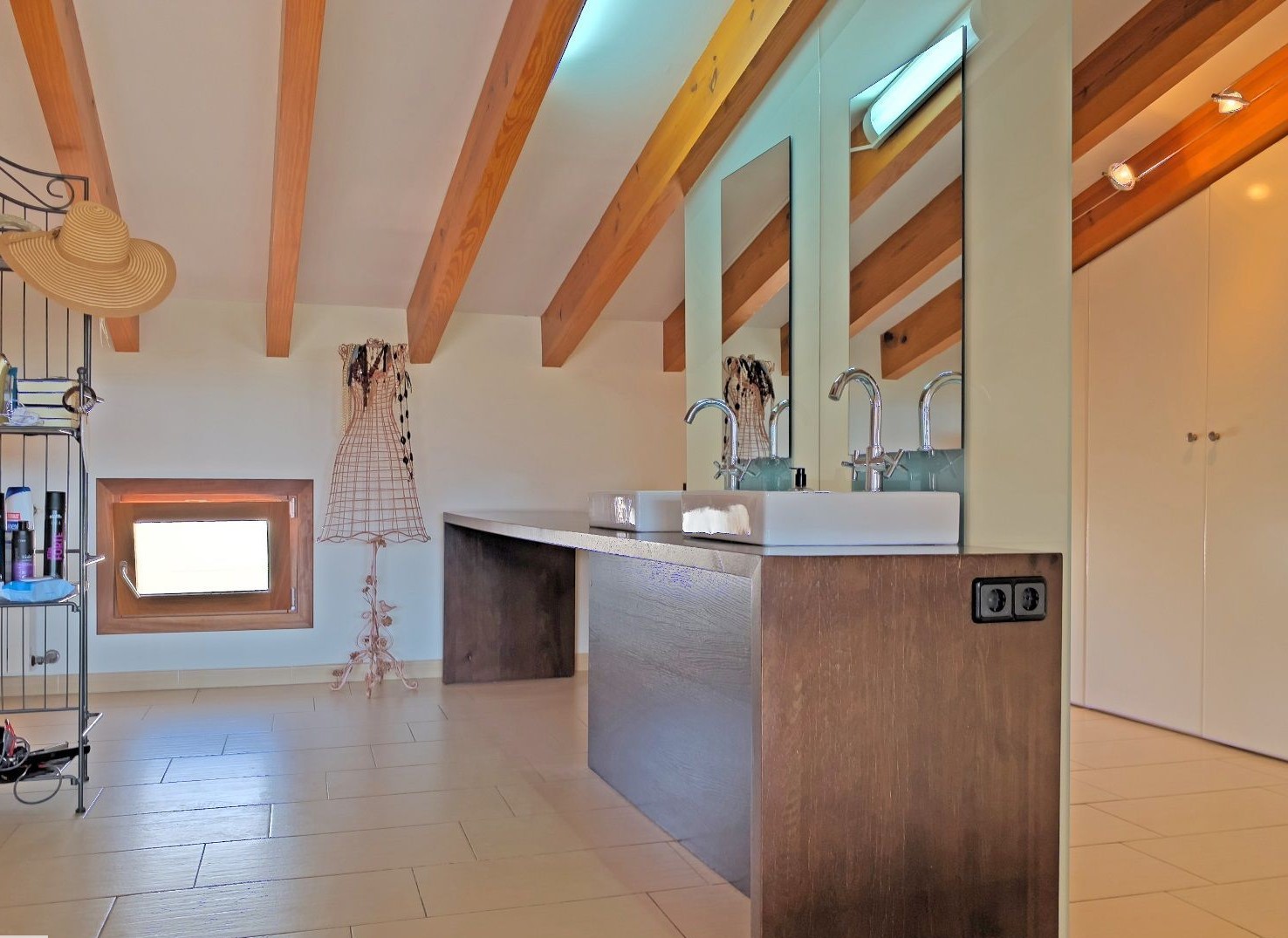 Von der Küche aus gelangt man in den ersten Stock, wo sich 3 Schlafzimmer und 2 Bäder (eines davon en suite) befinden. In der obersten Etage befindet sich schließlich das Hauptschlafzimmer. Es ist riesig, mit einem Wohnzimmer und einem großen Badezimmer, das eine schöne Glasdusche und eine tolle Designer-Badewanne hat. Neben dem Doppelwaschbecken finden wir einen schönen Ankleideraum. Von diesem Schlafraum aus hat man einen wunderschönen Blick auf Alcudia und einen Teil der Bucht von Puerto de Pollensa.
