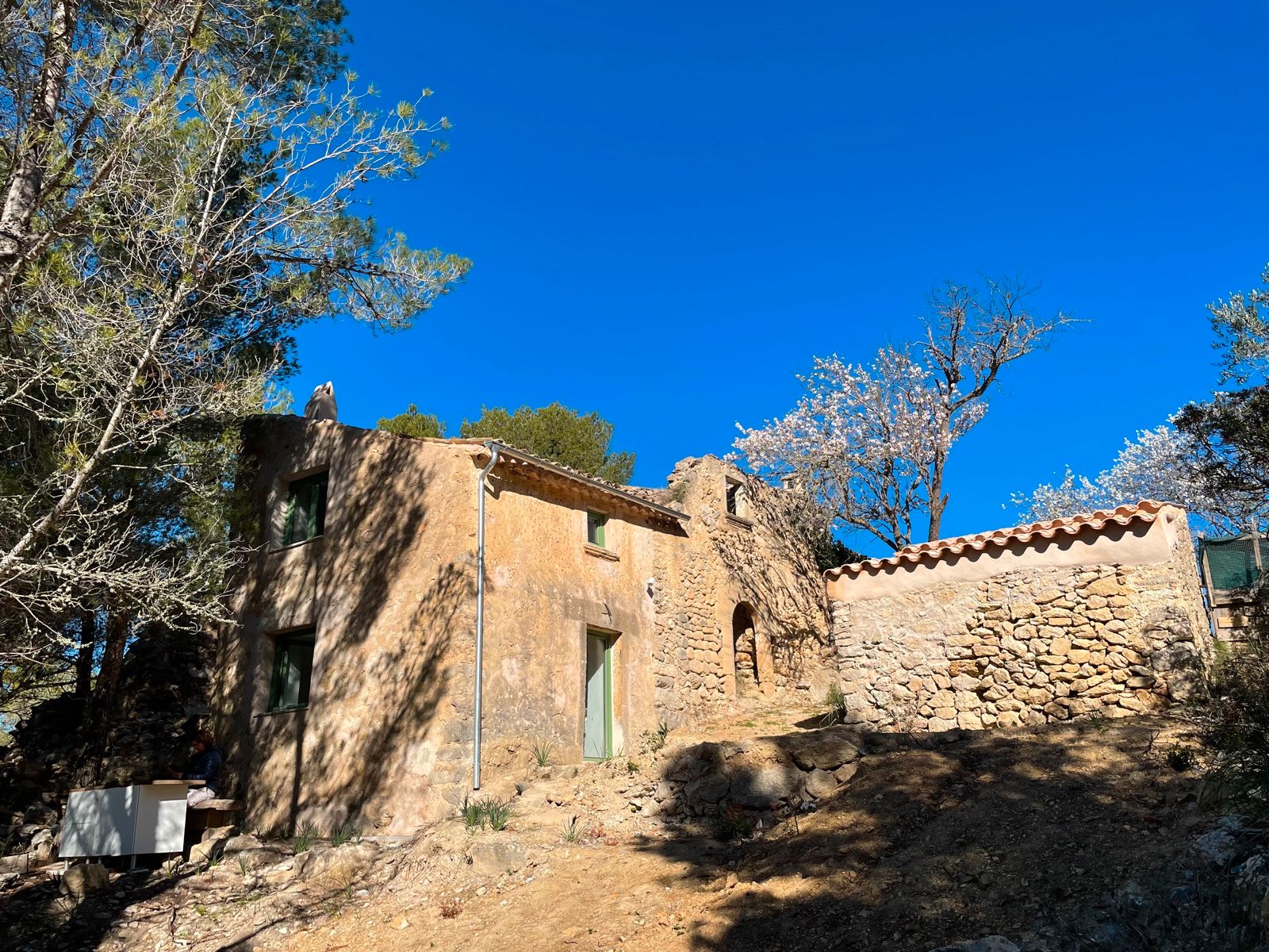 Das Grundstück sind 8.000 m² geschützter Pinien und Olivenwald. Die Zufahrt erfolgt über eine bergige Strecke (etwa 10 Minuten) vom nächst gelegenen Ort Es Capdella.
