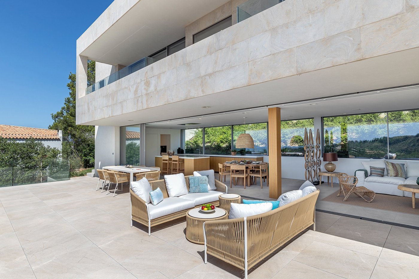Im oberen Bereich liegen drei Schlafzimmer, von denen zwei eine private Terrasse mit Blick auf den Pool haben mit drei Badezimmern und weiteren Wohnbereichen.
