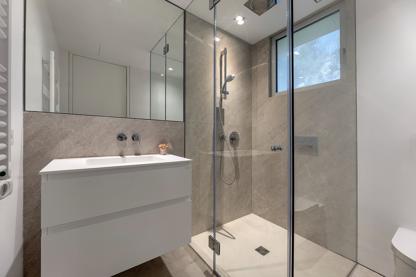 Im Untergeschoss mit einer Fläche von etwa 200 Quadratmetern befindet sich Sie ein Raum, der sich für einen Fitnessbereich oder ein Heimkino eignen würde. In diesem Räumlichkeiten liegt auch eine Garage für zwei Fahrzeuge, von der aus man das Haus direkt mit dem Aufzug erreichen kann. Zusätzlich befinden sich dort zwei Abstellräume.